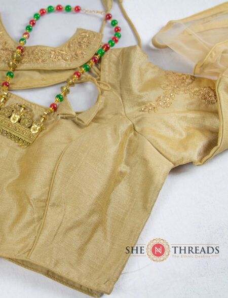 A Fully Stitched Padded Blouse made from Silver Banaasri Brocade with half Sleeves and Round Neck Design with Strings.