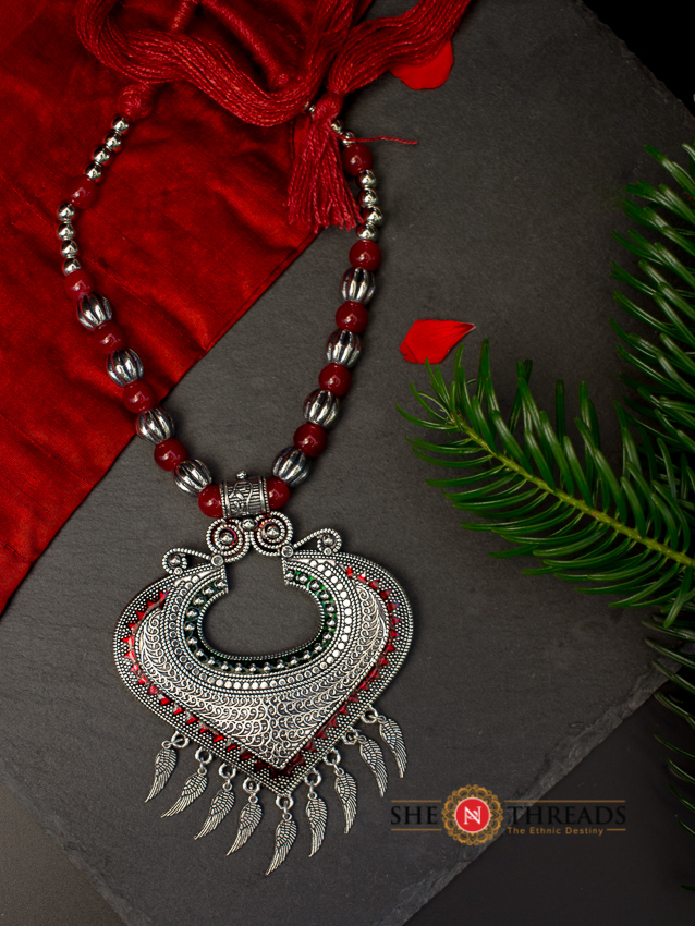 Oxidized Metal Pendant with Red beads and Red Thread, trendy western and antique look necklace