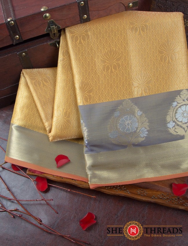 Banarasi Jaal Silk saree with golden Zari work all over the saree with a contrast Border.