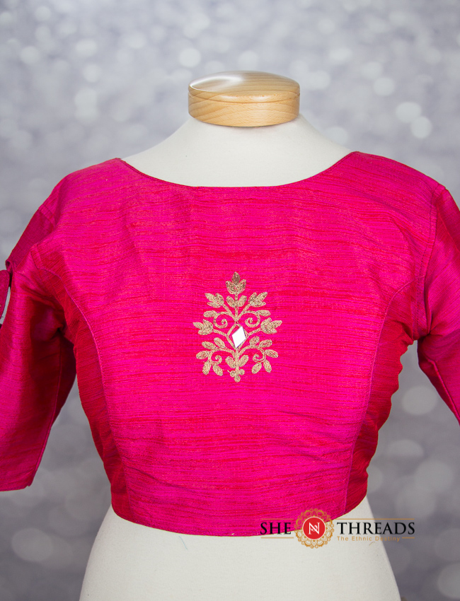 A Fully Stitched Padded Blouse made from Cotton Silk with half Sleeves and round Neck Design with Strings attached.