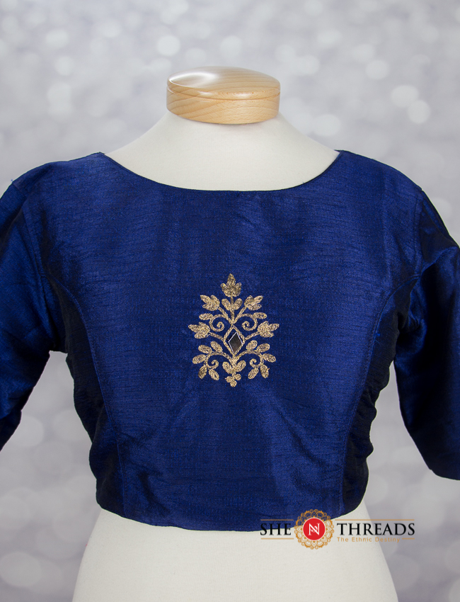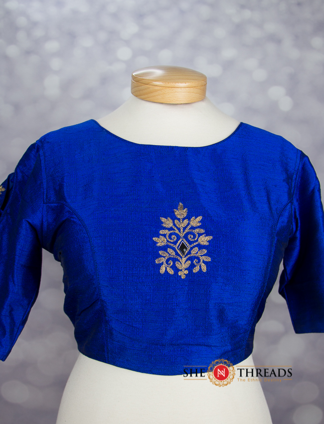 A Fully Stitched Padded Blouse made from Santoon Silk with Mega Sleeves and Boat Neck Design with Strings attached in the corner.