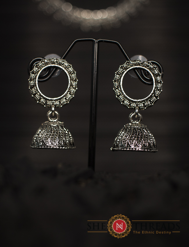 An attractive pair of oxidised silver plated handmade Jhumki earrings