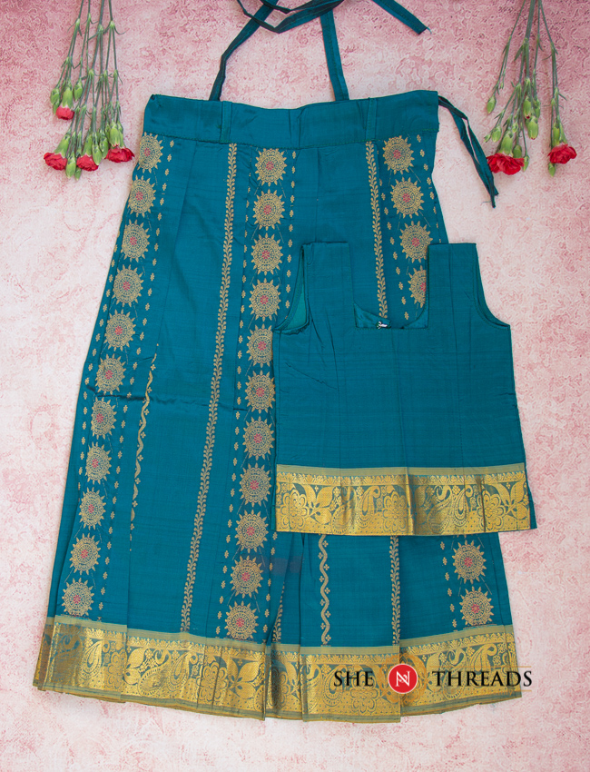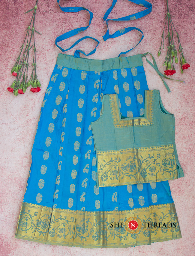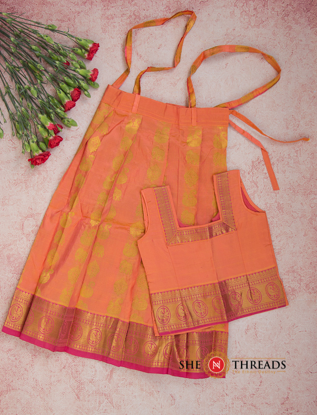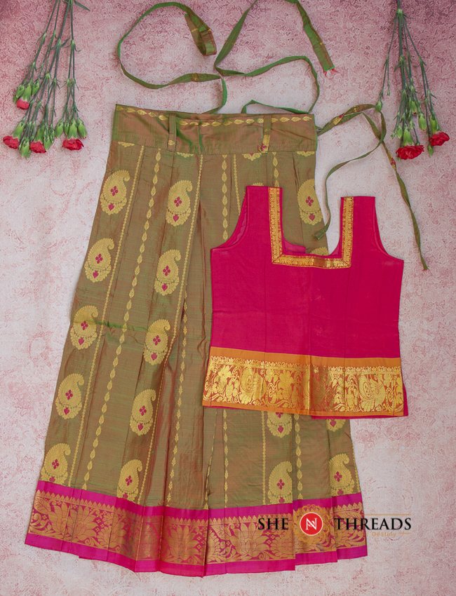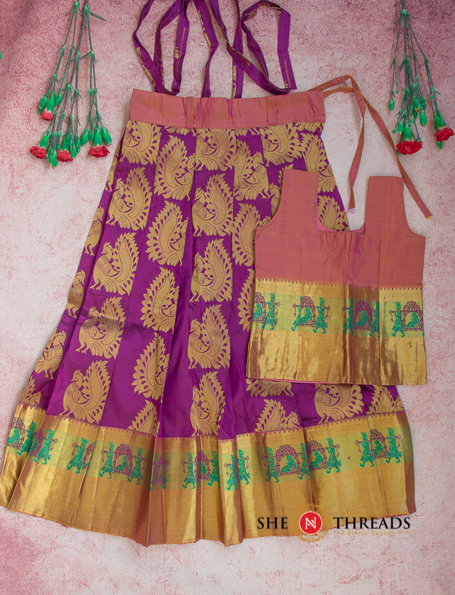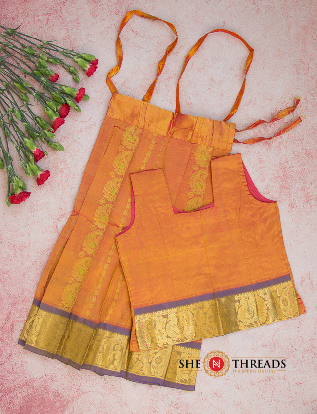 An elegantly traditional Kancheepuram Silk dress for our little ones with beautiful colors is the perfect attire for our special occasions and festivals.