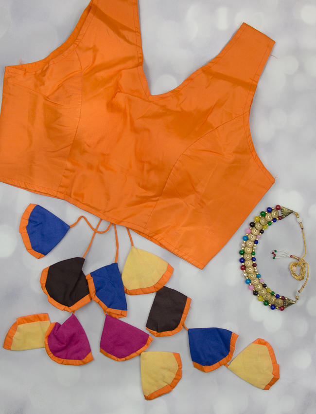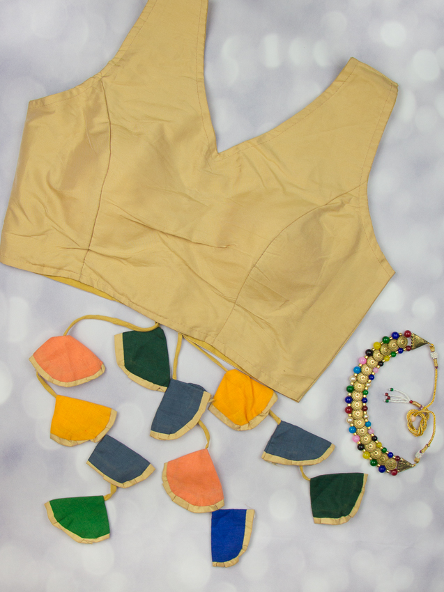 A Fully Stitched Padded Blouse made from Cotton Silk with half Sleeves and round Neck Design with Strings attached.