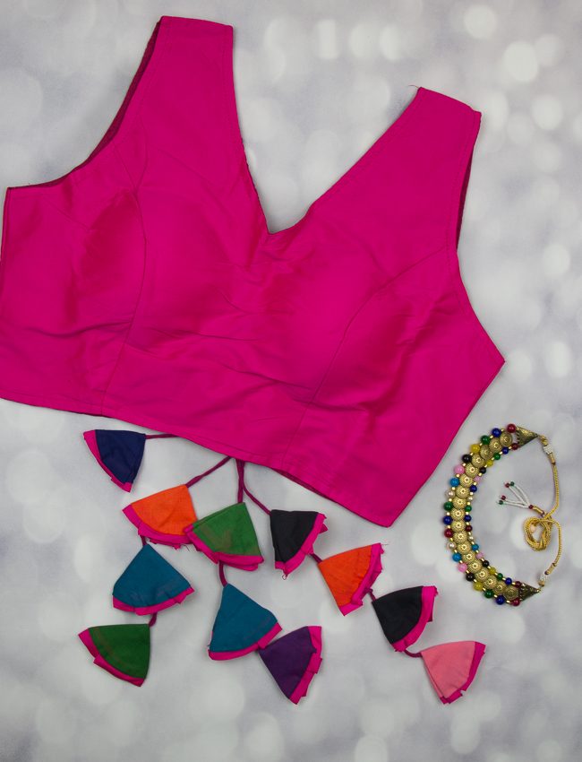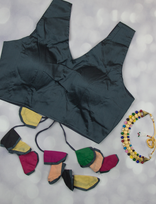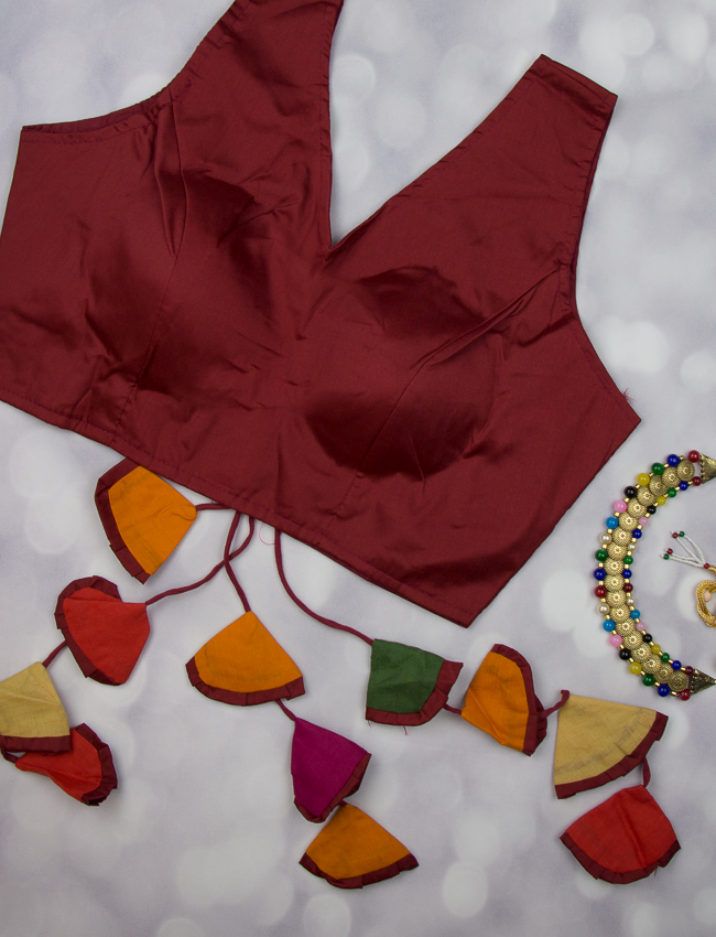 A Fully Stitched Padded plain Silk Blouse, sleeveless (Sleeves are available). It comes with a back hook closure with Strings attached.