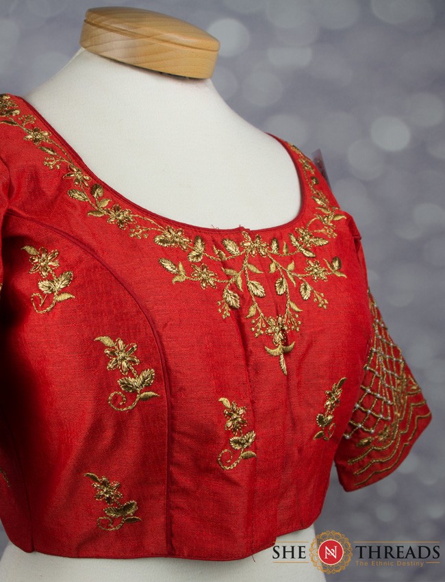 A Fully Stitched Padded Blouse made from Cotton Silk with half Sleeves and round Neck Design with Strings attached.